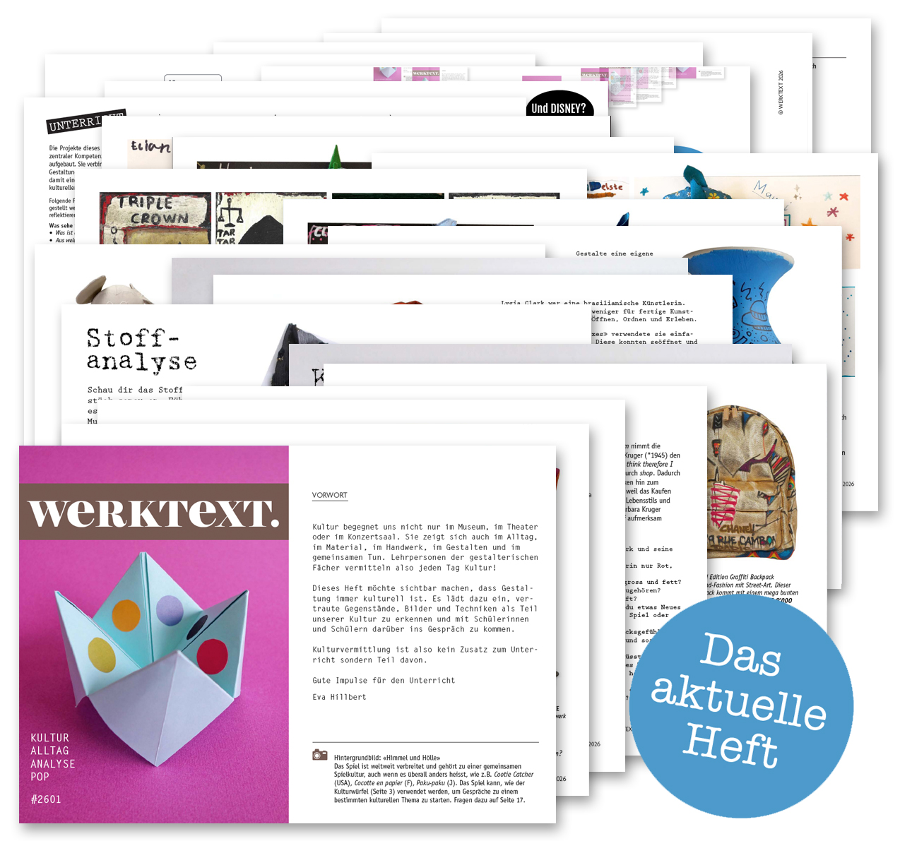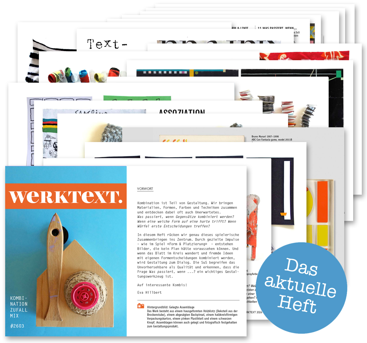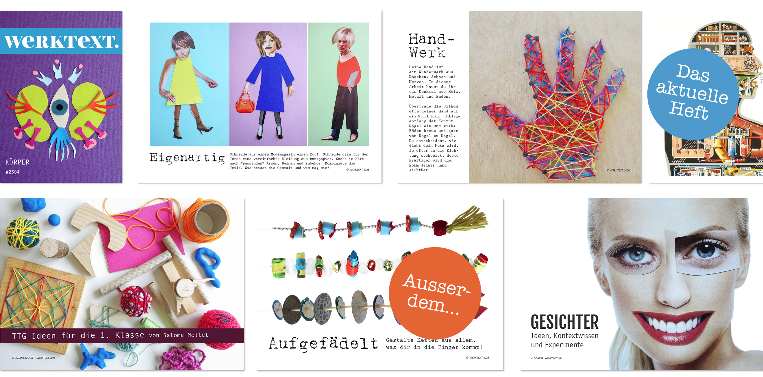 WERKTEXT richtet sich an Lehrpersonen der gestalterischen Fächer (BG und TTG), um sie in ihrer Arbeit zu unterstützen. Das digitale Magazin (PDF) enthält neben fachbezogenem Kontextwissen zu Kunst, Kultur, Material, Werkzeug und Technik prozessorientierte Gestaltungsprojekte. Sie sollen das Vertrauen in die eigenen kreativen Fähigkeiten stärken und die Lust am Entwickeln neuer Ideen wecken.