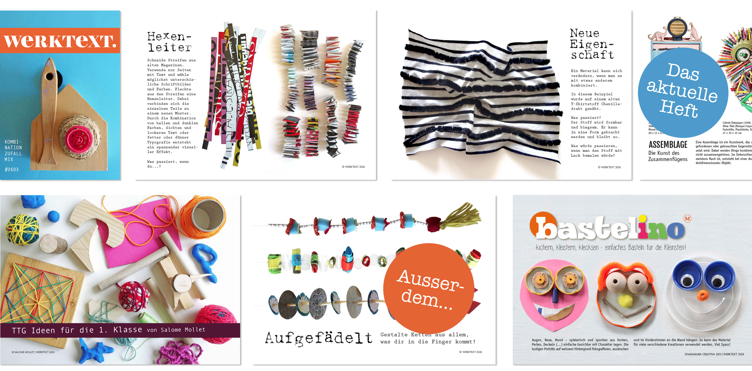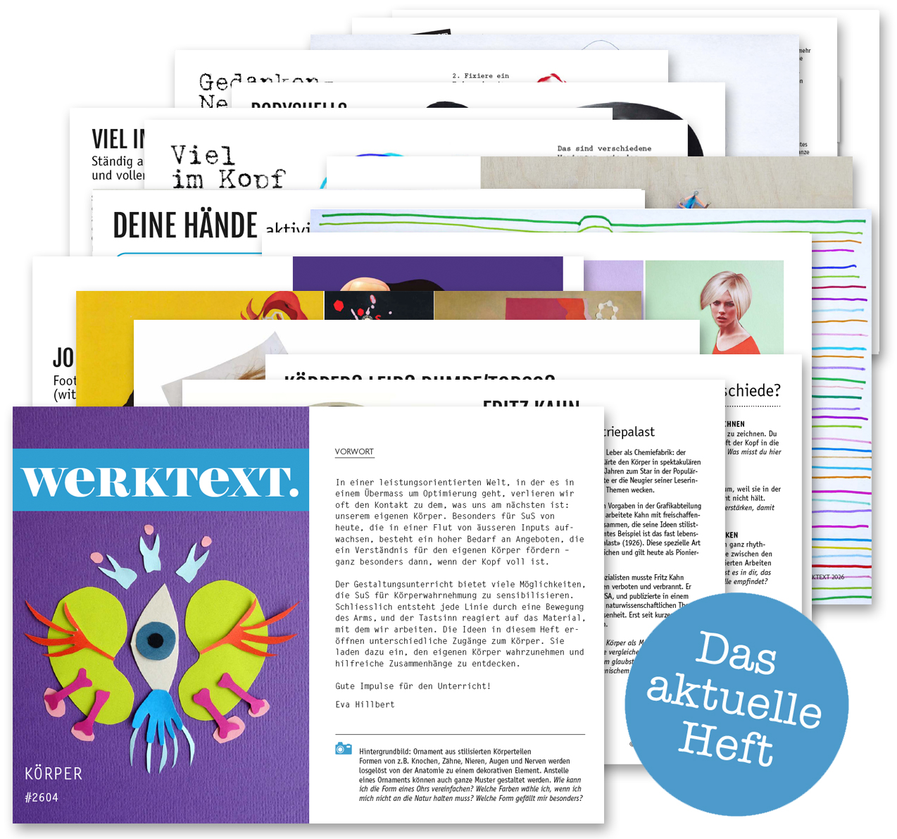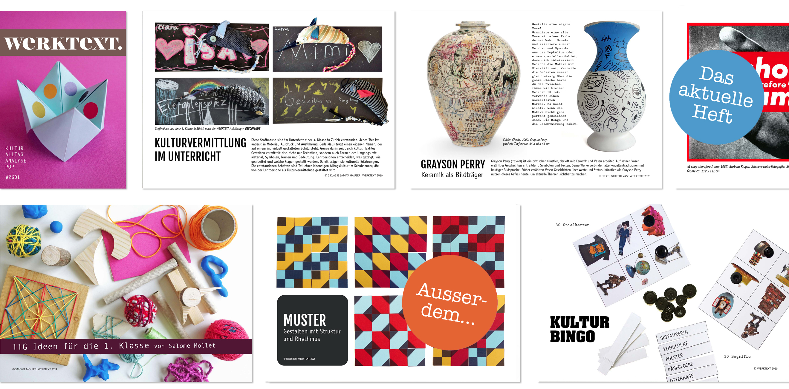 WERKTEXT richtet sich an Lehrpersonen der gestalterischen Fächer (BG und TTG), um sie in ihrer Arbeit zu unterstützen. Das digitale Magazin (PDF) enthält neben fachbezogenem Kontextwissen zu Kunst, Kultur, Material, Werkzeug und Technik prozessorientierte Gestaltungsprojekte. Sie sollen das Vertrauen in die eigenen kreativen Fähigkeiten stärken und die Lust am Entwickeln neuer Ideen wecken.