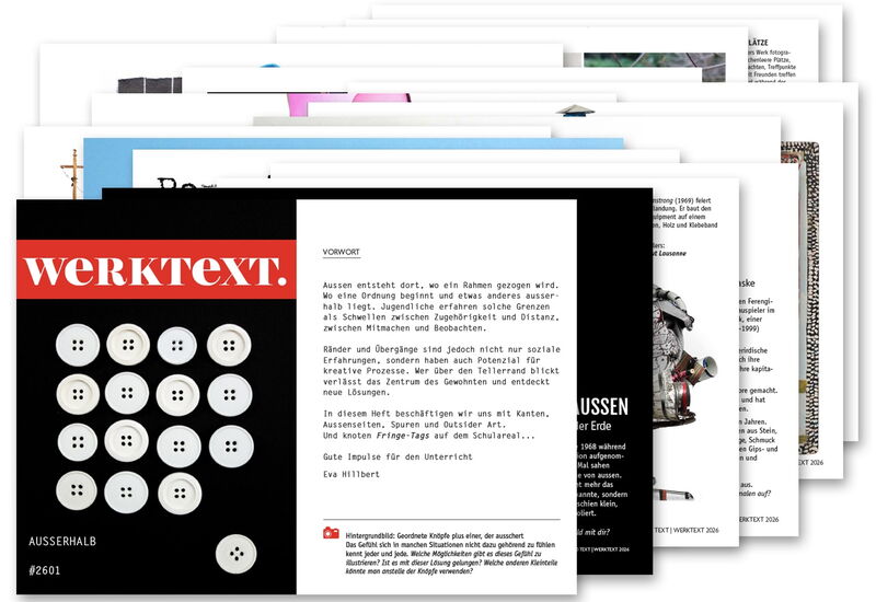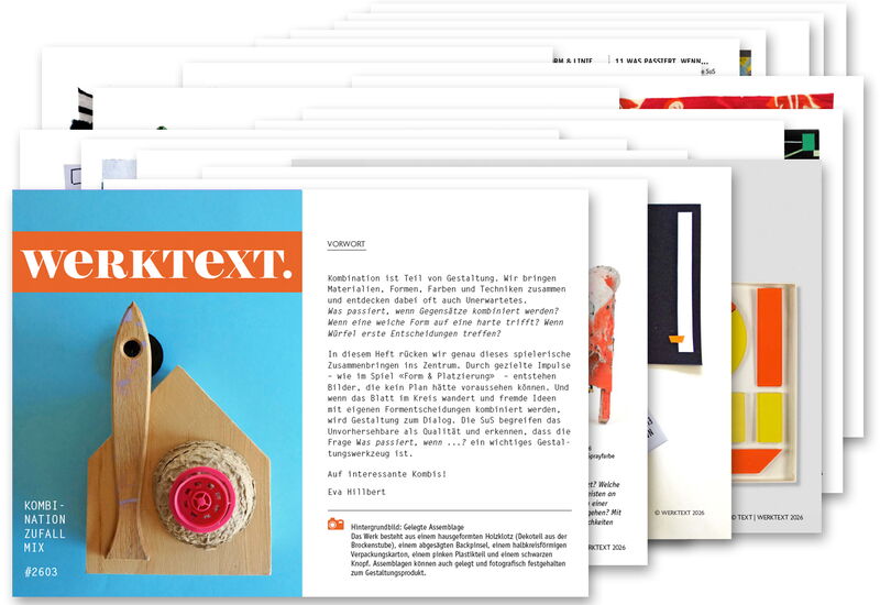 Seit 2021 erscheinen die WERKTEXT-Hefte regelmässig. Inzwischen sind über 51 Hefte voller Gestaltungsprojekte und Hintergrundwissen für den Unterricht zusammengekommen. Um den grossen Fundus an Inhalten leichter zugänglich zu machen, werden die älteren Hefte ab März 2026 nach und nach in thematische Dossiers zusammengefasst.