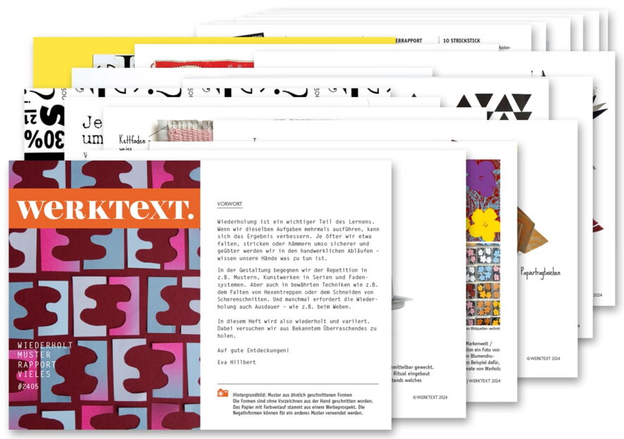 Wiederholung ist ein wichtiger Teil des Lernens. Je öfter wir etwa falten, stricken oder hämmern umso sicherer und geübter werden wir in den handwerklichen Abläufen – wissen unsere Hände was zu tun ist. In diesem Heft wiederholen und variieren wir. Dabei versuchen wir aus Bekanntem Überraschendes zu holen, u.A. falten wir Hexenleitern, legen und rapportieren Muster, verwandeln Scherenschnitte zu Objekten, besticken Gestricktes und stecken aus Rollenstreifen interessante Teile. Die Datei besteht aus 19 Seiten im PDF-Format. Das Heft enthält neben Gestaltungsideen, begleitendes Kontextmaterial und Hinweise für den Unterricht, sowie drei Anleitungen und eine Vorlage zum Ausdrucken.