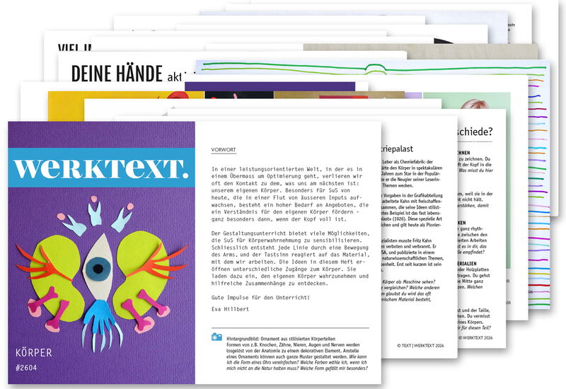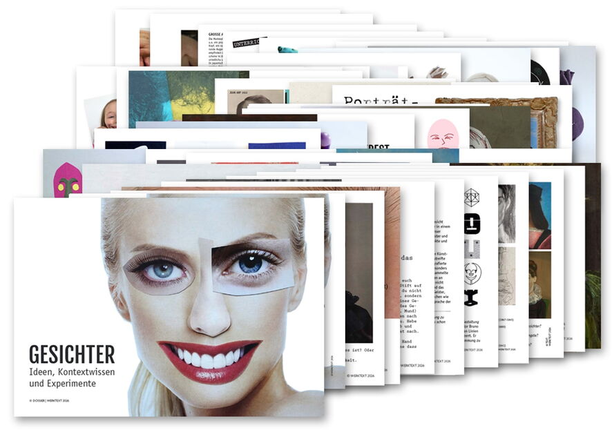 Die Auseinandersetzung mit dem Porträt schult nicht nur technisches Können, sondern ist immer auch die Frage nach der eigenen Identität und der Wahrnehmung des Gegenübers. Dieses Dossier bietet eine fundierte Sammlung an Impulsen aus dem Archiv, die das Gesicht weit über die klassische Zeichnung hinaus erfahrbar machen. Das Dossier besteht aus 40 Seiten. Es ist als offene Sammlung konzipiert, die sowohl kurze Experimente als auch vertiefende Projektarbeiten ermöglicht. Der Inhalt in Stichwörtern: Collage, Sehen & Schauen, Liniengesichter, Pareidolie, Vielfalt, Porträts aus der Kunstgeschichte, Proportionen, Arcimboldo, Gesichter legen, Naturmaterial, Masken, Scherenschnitt, Merkmale, Emotionen, Porträtkulisse, Zyklop, Selfies, Dekonstruktion, Spiegelung, Fotogrimasse, schnelle Köpfe (Spiel), Nylonköpfe, Picasso, Bälle…