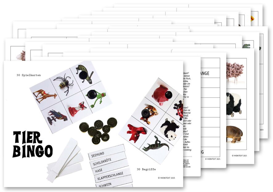 Seit der Steinzeit gehören Tiere zu den wichtigsten Bildmotiven des Menschen. Im Spiel entdecken die SuS gestaltete Tiere in unterschiedlichsten Materialien und Funktionen. Sie üben dabei genaues Hinschauen, Vergleiche anzustellen und Formen, Oberflächen und Herstellungsarten zu unterscheiden. Die Kombination aus Suchen, Erkennen und Vergleichen schafft eine hohe Motivation. Das Tier-Bingo eignet sich besonders gut als Einstieg in Materialkunde, Formanalyse, 3D-Gestaltung oder als Aktivität zwischendurch, um den Blick für gestaltete Alltagsobjekte zu schärfen. Die Datei besteht aus 18 Seiten (PDF) mit / 1. Spielregeln und möglichen Fragen / 2. 30 Begriff-Kärtchen / 3. 30 unterschiedlichen Spielkarten à 6 Bilder. Das Spiel kann auf Fotopapier ausgedruckt und ausgeschnitten werden. Es eignet sich auch laminiert zu werden.